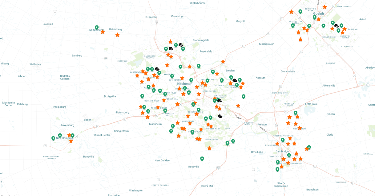 Kitchener, Waterloo, Cambridge, Woolwich, Wellesley, Wilmot, and North Dumfries.