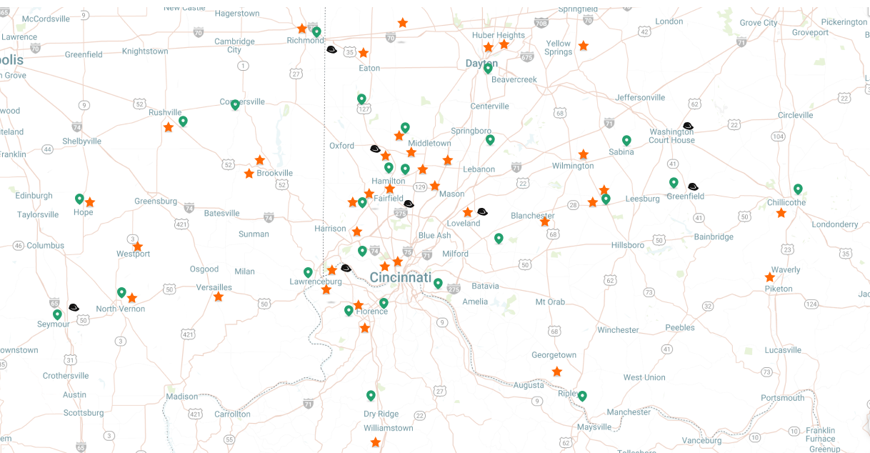 Amelia, Batavia, Blue Ash, Burlington, Cincinnati, Covington, Dayton, Dillsboro, Erlanger, Fairfield, Florence, Goshen, Hamilton, Harrison, Hebron, Independence, Lebanon, Mason, Middletown, Monroe, Newport, Norwood, Oxford, Reading, Sharonville, Springdale, Union, Walton, West Chester, White Oak.