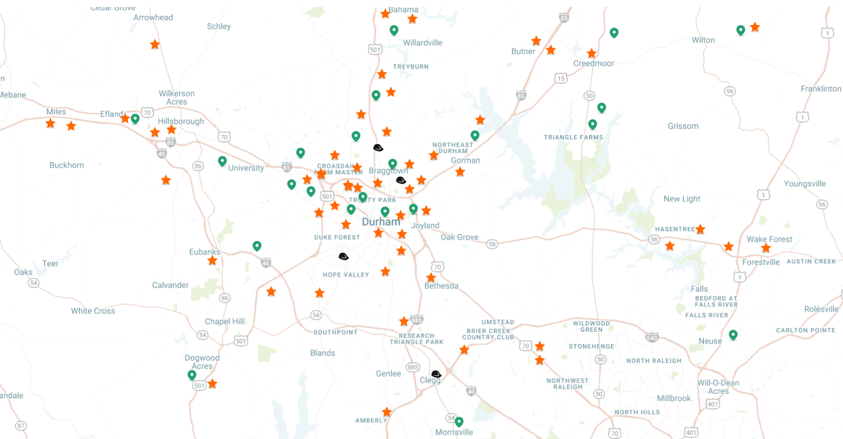 Apex, Butner, Carrboro, Cary, Chapel Hill, Creedmoor, Durham, Fuquay-Varina, Garner, Hillsborough, Holly Springs, Mebane, Morrisville, Oxford, Raleigh, Roxboro, Wake Forest.