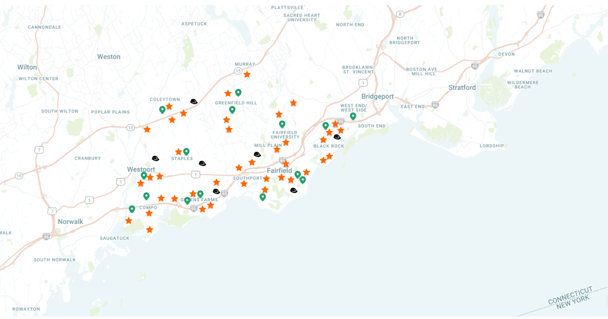 Ansonia, Bethel, Bridgeport, Brookfield, Danbury, Darien, Derby, Easton, Fairfield, Greenwich, Milford, Monroe, New Canaan, Newtown, Norwalk, Orange, Oxford, Redding, Ridgefield, Shelton, Southbury, Stamford, Stratford, Trumbull, Weston, Westport, Wilton.