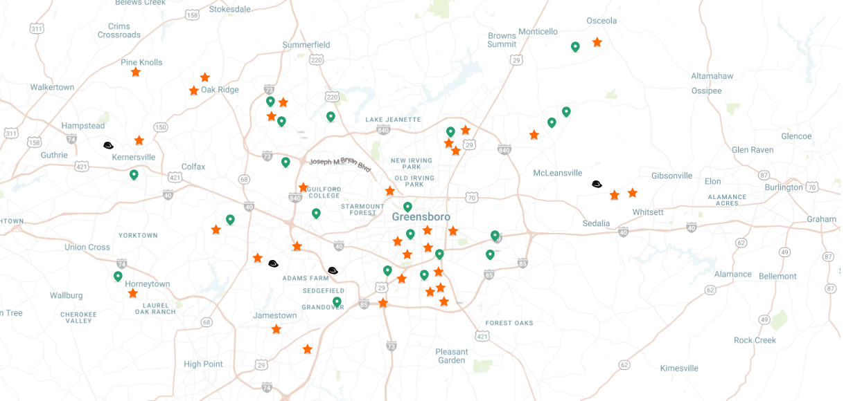 Archdale, Asheboro, Brown Summit, Burlington, Climax, Colfax, Elon, Gibsonville, Graham, Greensboro, Haw River, High Point, Jamestown, Julian, Kernersville, Liberty, McLeansville, Mebane, Oak Ridge, Pleasant Garden, Randleman, Reidsville, Sedalia, Stokesdale, Summerfield, Thomasville, Whitsett.