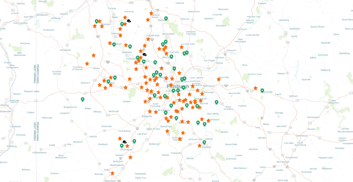 Bellevue, Brentwood, Carnegie, Dormont, Emsworth, Fox Chapel, Imperial, Kennedy Township, Monroeville, Mt. Lebanon, Munhall, North Versailles, Oakdale, Penn Hills, Pittsburgh, Pleasant Hills, Scott Township, Swissvale, Verona, West Mifflin, Wilkinsburg.