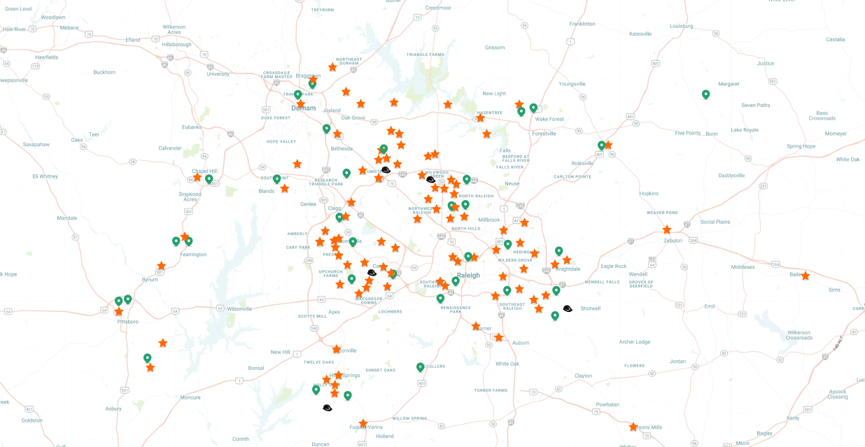 Raleigh, Apex, Cary, Clayton, Fuquay-Varina, Garner, Holly Springs, Knightdale, Morrisville, Rolesville, Wake Forest, Wendell, and Zebulon.