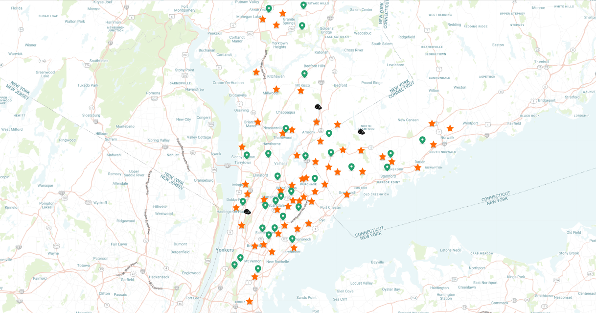 Ardsley, Bedford, Briarcliff Manor, Bronxville, Buchanan, Central Westchester, City of Yonkers, Cortlandt, Croton on Hudson, Dobbs Ferry, Eastchester, Elmsford, Greenburgh, Harrison, Hastings on Hudson, Irvington, Larchmont, Lewisboro, Lower Westchester, Mamaroneck, Mount Kisco, Mount Pleasant, Mount Vernon, New Castle, New Rochelle, North Castle, North Salem, Northern Westchester, Ossining, Peekskill, Pelham, Pleasantville, Port Chester, Pound Ridge, Rye, Rye Brook, Scarsdale, Sleepy Hollow, Somers, Tarrytown, The Rivertowns, Tuckahoe, White Plains, Yorktown.