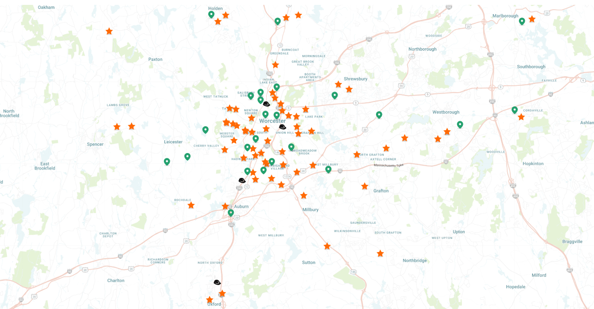 Auburn, Jefferson, Grafton, Holden, Leicester, Millbury, Northborough, Northbridge, Oxford, Rutland, Paxton, Shrewsbury, Sutton, Upton, Westborough, West Boylston, Worcester.